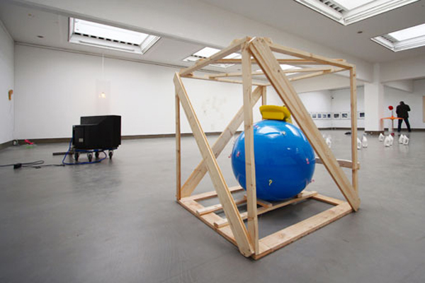 Gymnastikball, Nackenkissen, Holz, 90 x 90 x 90 cm, 2008.