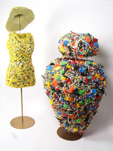 Small Talk. Puppen I + II. Stahl, Draht, Stoff, Folie, Haushaltsutensilien-Kleber, 160 x 100 x 93 cm, 2009.